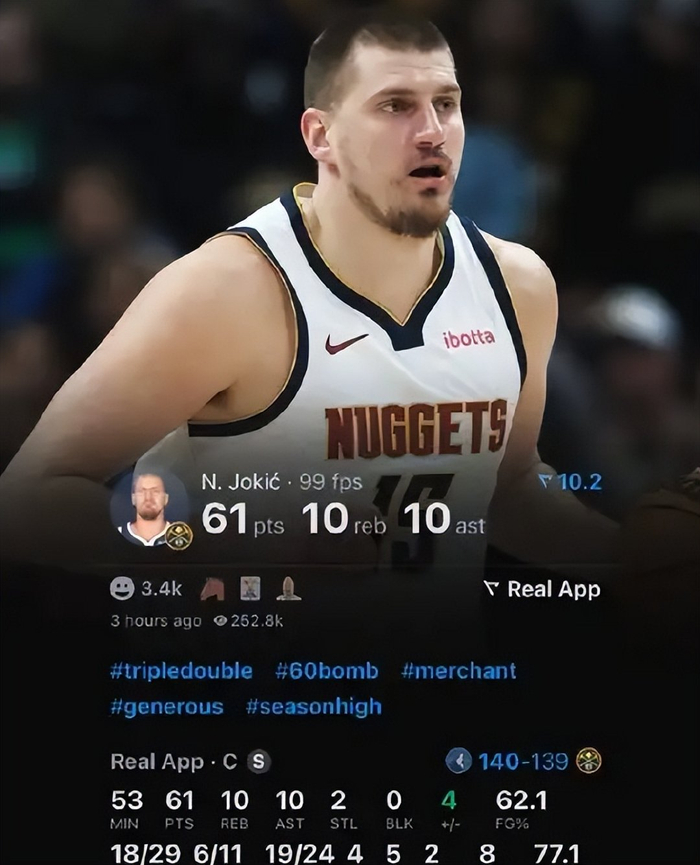 2025年4月1日,约老师再创神迹,他整场比赛29投18中,三分球11投6中,拿下了61分10篮板10次助攻的大号三双数据。作为中锋,能砍下60+三双实属不易。